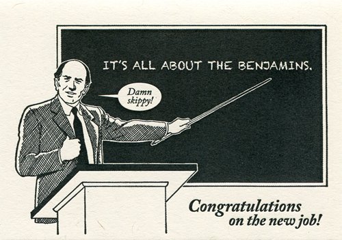 “It’s all about the Benjamins. Damn Skippy. Congratulations on the new job!”